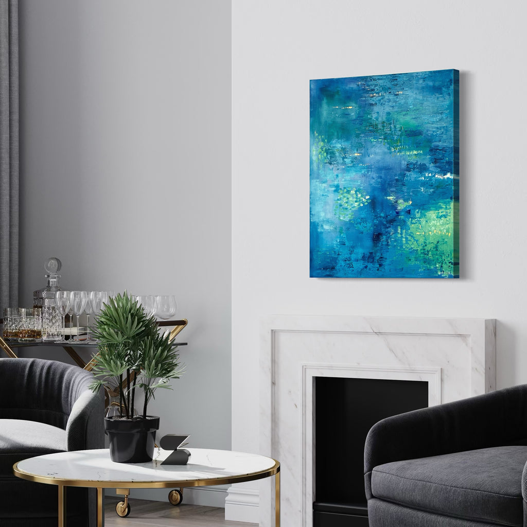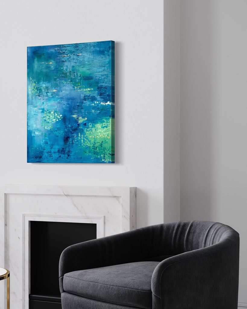 [Although they are abstract in nature, Andrea considers her paintings landscapes - as each one is inspired by a specific place and time. Water features prominently in her work, as does sunlight, which is why each piece features iridescent pigments. Her technique involves building up the canvas with molding paste before paint is even added. She then applies paint in many (many) layers, scraping and carving with various tools as she goes. She is always trying to achieve depth in her work and her hope is for each viewer to feel compelled to travel through the layers, finding a personal memory with which they can connect.]